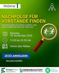 Europa-Union und JEF Deutschland laden am Dienstag, 18. November 2025, um 19.00 Uhr zu einem Webinar zum Thema Vorstandswechsel ein. Manchmal wird die Übergabe von Ämtern zum Hindernislauf: Es scheint immer schwieriger zu werden, Nachfolgerinnen und Nachfolger für Vorstandsämter in Vereinen zu gewinnen, so auch bei der JEF und der Europa-Union. „Zu viel Bürokratie, zu viel Verantwortung und zu viel Zeit“, diese „Vorurteile“ haben bestimmt viele schon einmal gehört. Dass es nicht so laufen muss, wollen wir in dieser Ausgabe der… » weiterlesen