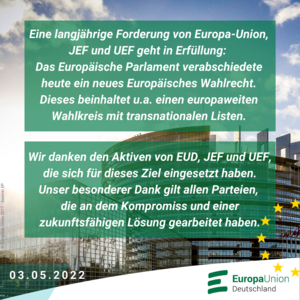 Eine langjährige Forderung von Europa-Union, JEF und Union Europäischer Föderalisten ist heute in Erfüllung gegangen: Das Europäische Parlament verabschiedete ein neues Wahlrecht für die Europawahl 2024. Es sieht unter anderem die Schaffung eines europaweiten Wahlkreises vor. Mit einer zweiten Stimme können die Wählerinnen und Wähler künftig eine europaweite Liste wählen. 28 Mandate sollen auf diese Weise vergeben werden. Über die transnationalen Listen sollen auch die von ihren Parteienfamilien aufgestellten europäischen… » weiterlesen