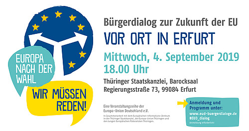 Am 4. September macht die bundesweite Bürgerdialogreihe der Europa-Union Deutschland „Europa nach der Wahl - Wir müssen reden!“ Station in Erfurt. Beim Bürgerdialog um 18 Uhr in der Staatskanzlei kommt das Publikum mit Politikern und Experten persönlich ins Gespräch. Wie steht es um die Werte und den Zusammenhalt in der EU? Wie kommen europäische Regelungen zustande und welchen Mehrwert haben sie vor Ort? Ziel des Bürgerdialogs ist es, Raum für den Austausch von Meinungen, Sorgen und Hoffnungen zu schaffen. » weiterlesen