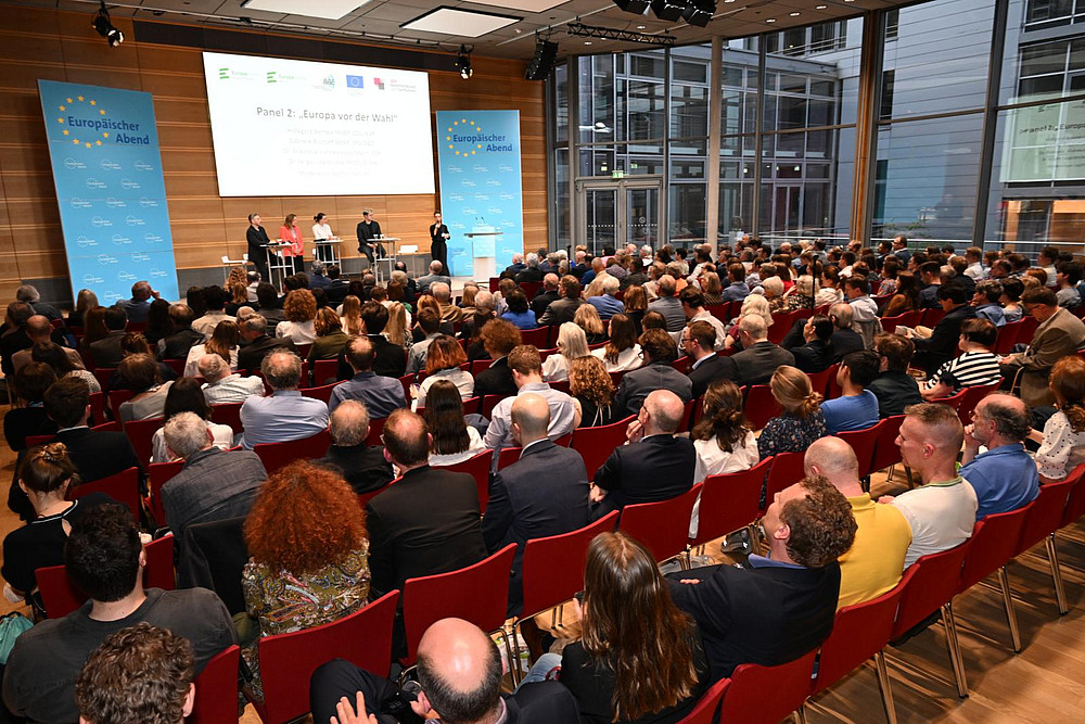 Bei dem anschließenden Panel mit Berliner Spitzenkandidatinnen und -kandidaten zur Europawahl ging es unter anderem um die Themen Klima- und Industriepolitik, Desinformation sowie den vom Europäischen Parlament geforderten EU-Konvent.