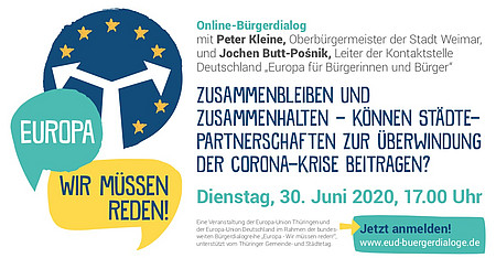 Veranstaltet wird der Bürgerdialog von der Europa-Union Thüringen e.V., unterstützt vom Thüringer Gemeinde- und Städtebund und der überparteilichen Europa-Union Deutschland im Rahmen der Bürgerdialogreihe „Europa – Wir müssen reden!“. Weitere Informationen und Angebote finden Sie auch unter www.eud-buergerdialoge.de.