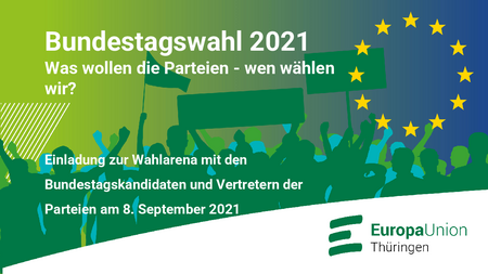 Wissen Sie eigentlich, wieviel Europa in der Bundestagswahl steckt? Deswegen wollen wir gerade diese Fragen mit den Ihnen diskutieren! Und natürlich mit den Kandidatinnen und Kandidaten der Fraktionen des Bundestages. Diese haben wir im Vorfeld zu ihren Programmen, Zielen und Vorsätzen in unseren "Wahlprüfsteinen" befragt. Als Europa-Union Thüringen, Gliederungsverband der Europa-Union Deutschland, der größten Bürgerinitiative im Sinne Europas, setzen wir auf die Weiterentwicklung der Europäischen Union. Insbesondere möchten wir, die Bürgerinnen und Bürger, wissen, wie sich die Kandidaten zu den europäischen Herausforderungen positionieren.